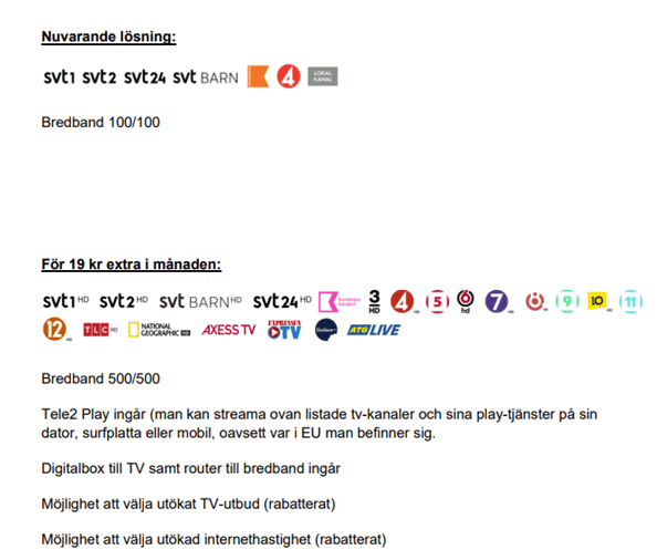 Från juli har vi gruppavtal för bredband på plats avseende 100/100 i ledningarna till 169 kronor/månad (ligger med på avierna). En besparing på cirka 3 000 kronor per hushåll/år jämfört ordinarie prislista för individuella avtal 100/100 kapacitet (ca 460 kronor/månad).