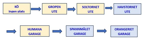 En angelägen fråga för många medlemmar. Nedan är flödet i garagekön. Notera att de platser föreningen äger är ’Havstornet ”ute”’, Spannmålet (35 platser) och Orangeriet (28 platser). Övriga hyr vi från olika hyresvärdar.